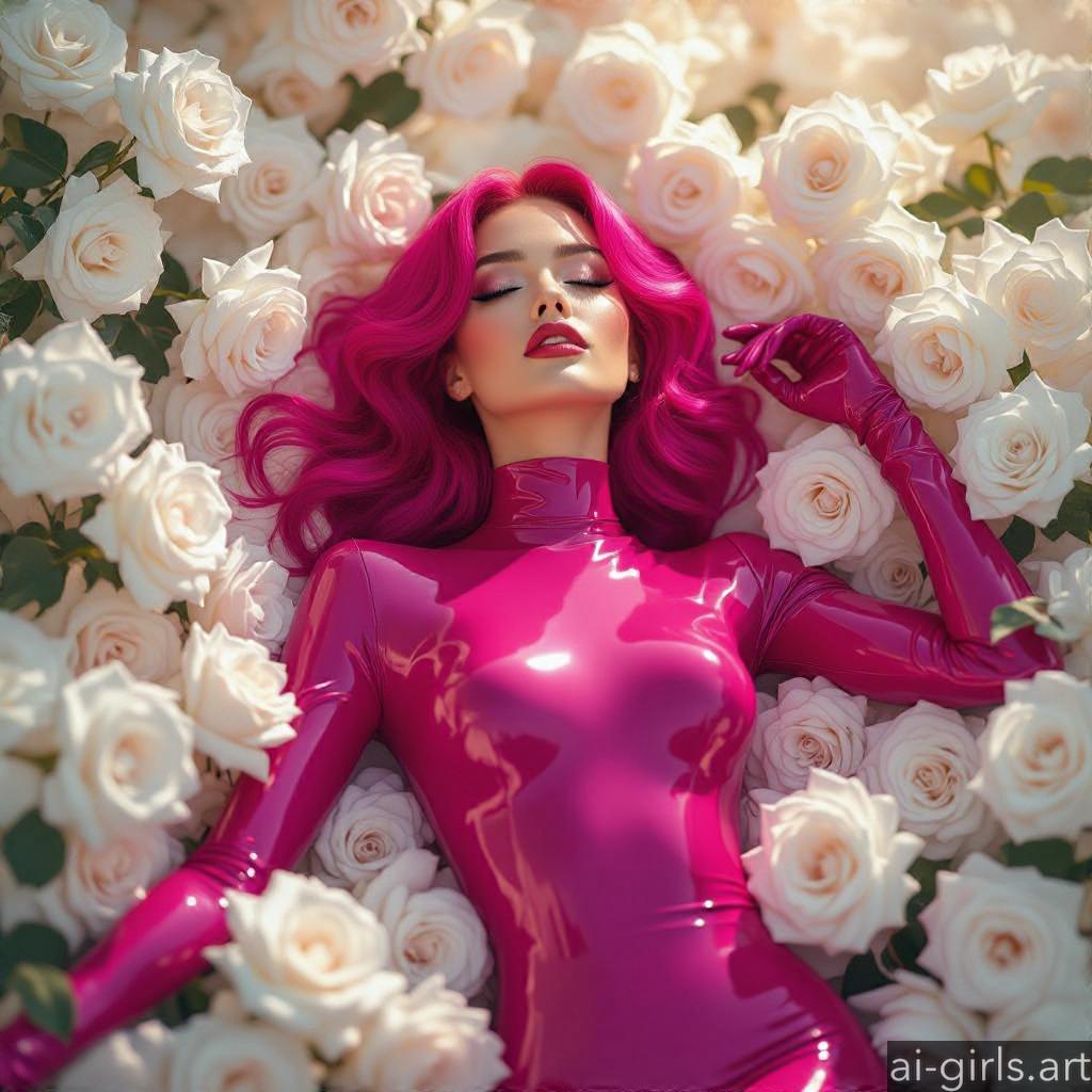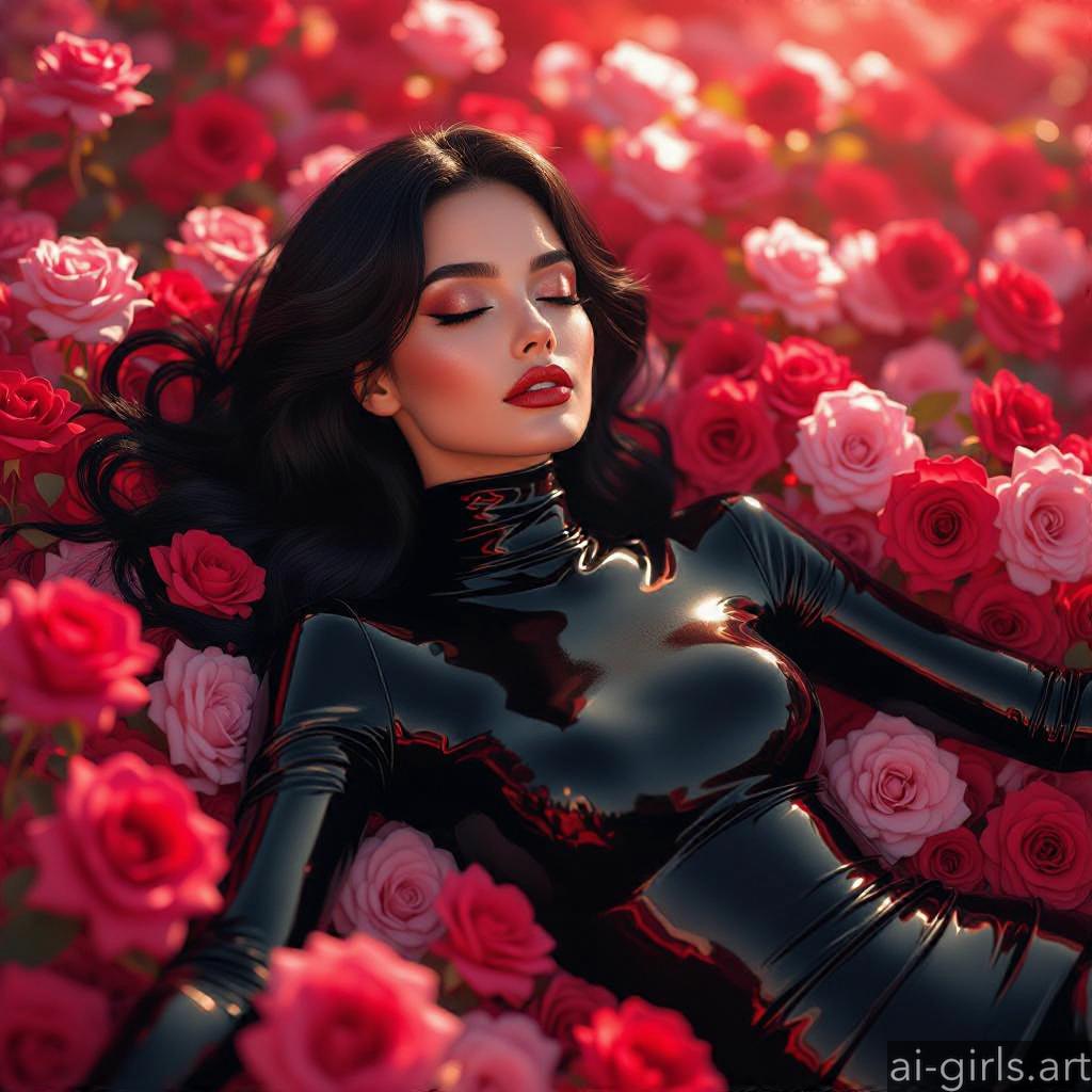 Beautiful AI girls in latex catsuit lying on roses